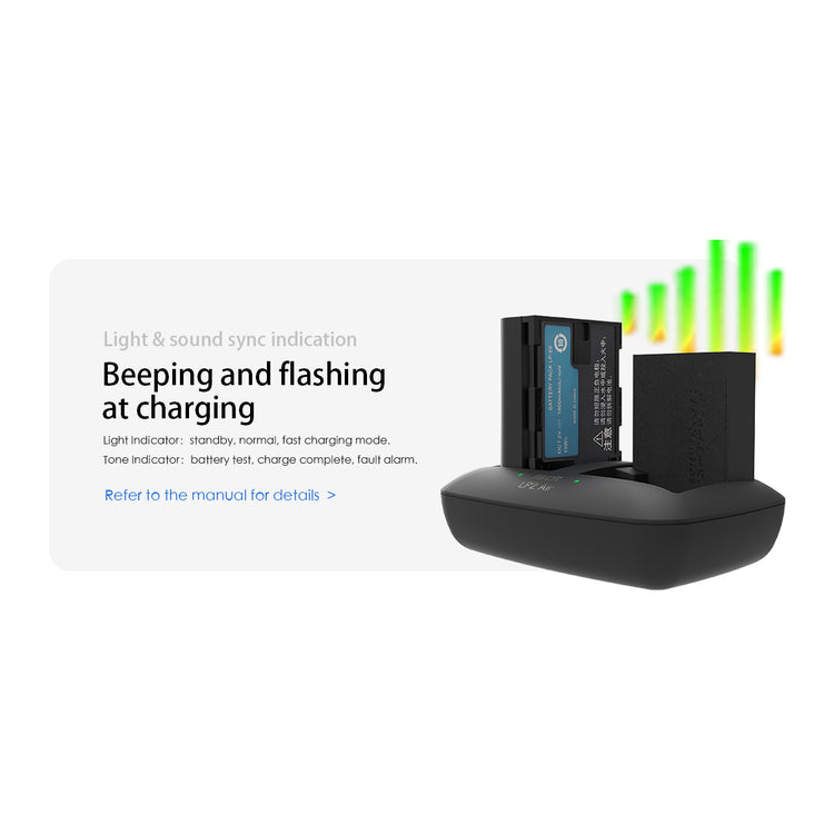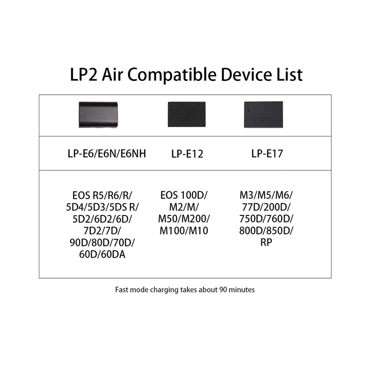 ⚡【Light & sound sync indication, Support 2 charge mode】 Indicator light: standby, normal, fast charging mode. Prompt sound: battery detection, charging completion, fault alarm.The LP2 Air camera charger supports 2 charge mode: It takes 120 minutes to fully charge in normal mode and 90 minutes in fast charge mode to fully charge your LP-E6,LP-E6N,LP-E6NH,LP-E12 and LP-E17 Batteries.