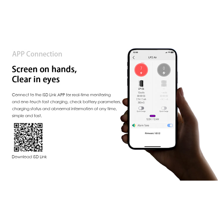⚡【APP Connection】ISDT LP2 Air LP-E6/E6N/E6NH charger, with ISD Link App, you can real-time monitor battery parameters, charging status and exception information. One-click to fast charging, simple and fast.