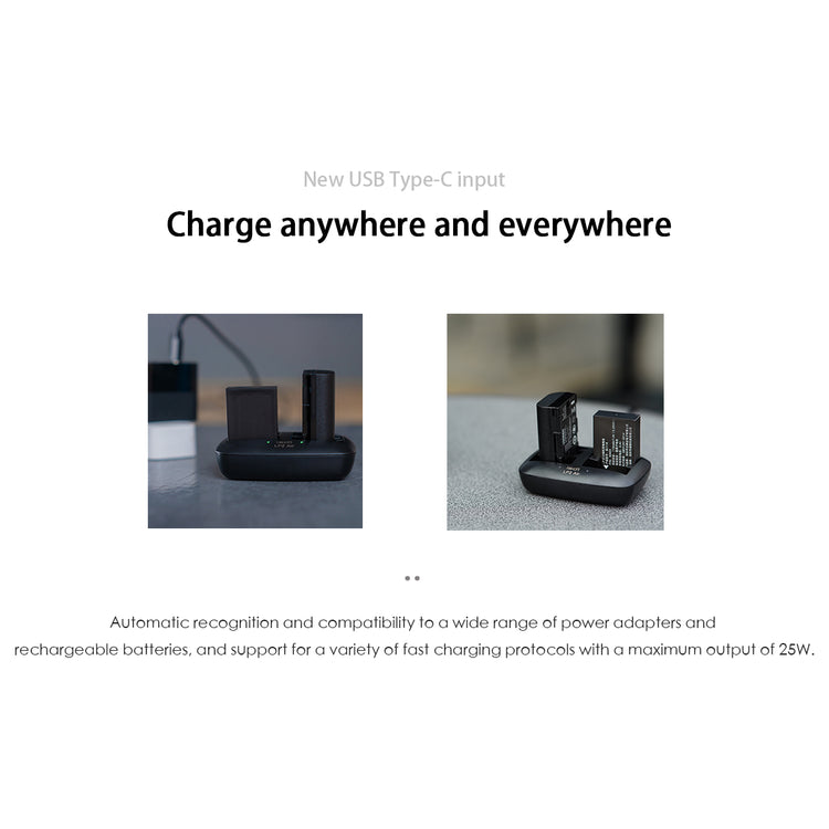⚡【Universal USB Type-C power input】The M50 battery charger can automatically recognizes and is compatible with various specifications of power adapters and power banks, supports a variety of fast charging protocols, and has a maximum output of 25W to achieve extremely fast charging.