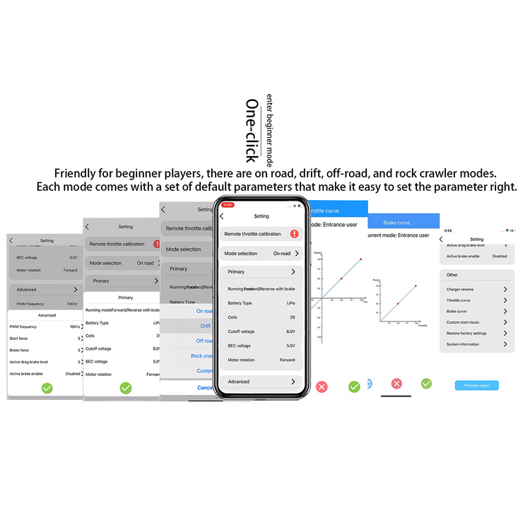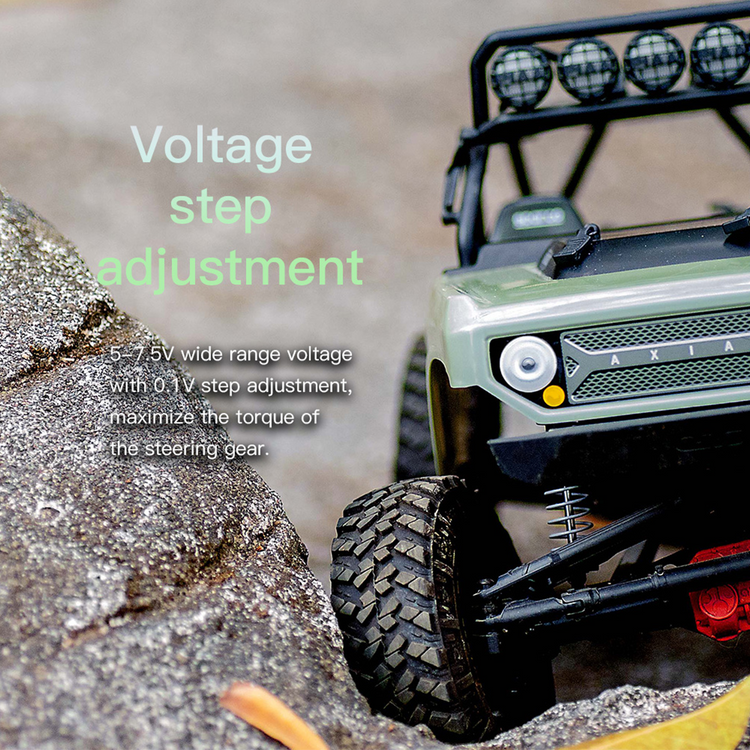 【RC crawler esc】Adjustable Active drag brake function and adjustable Brake force or initial braking. Slope anti-skid locking function specially designed for RC Crawler that characteristics operating on toughest terrain.