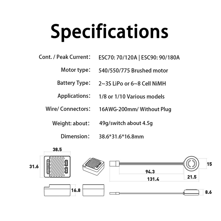 【Brushed Crawler Esc 1/10】The electronic speed controller,adjustable PWM frequency and advanced synchronous function provide ideal throttle curve and outstanding performance for dierent vehicles, conditions.