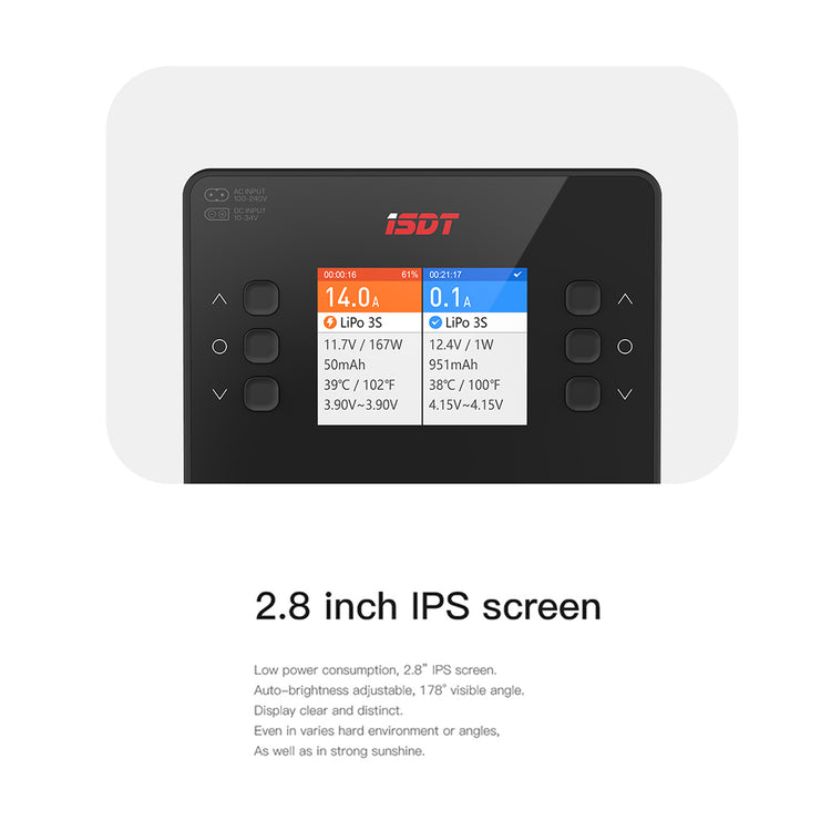 ⚡【Safe Access】ISDT K2 air lipo charger discharger : fool-proof input interface. Smart design. The DC input port and the AC input connector are mutually exclusive. Only one input can be selected in one time. Ensure the safety operation.